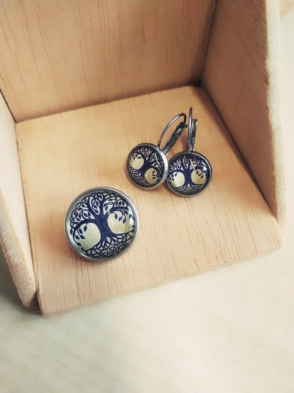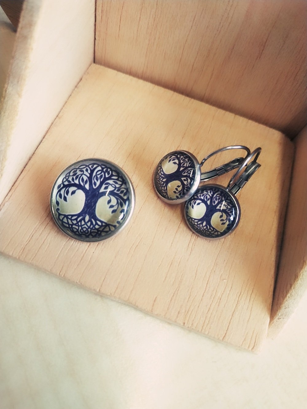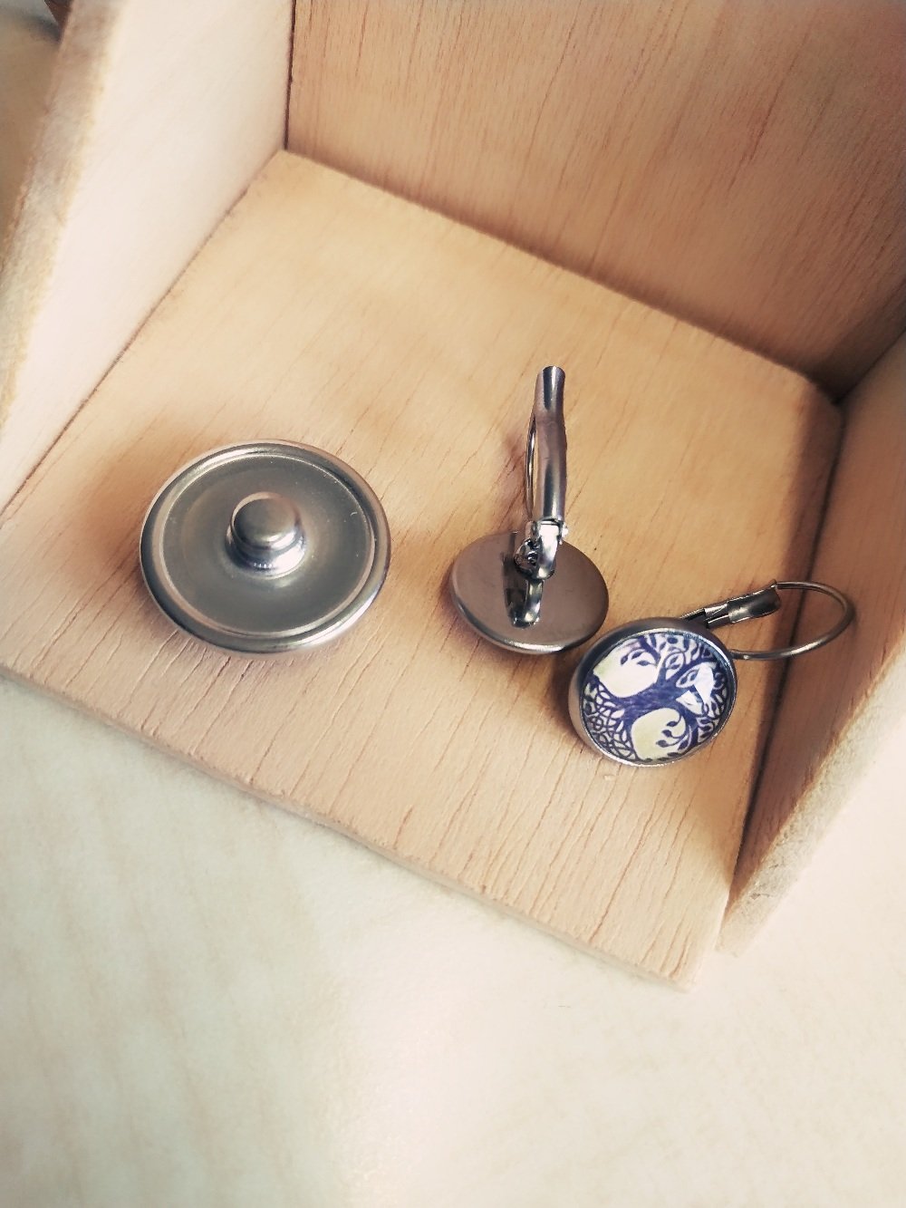 Dieses Set besteht aus einem Cabochon-Druckknopf und einem passenden Paar Hängeohrringen.
