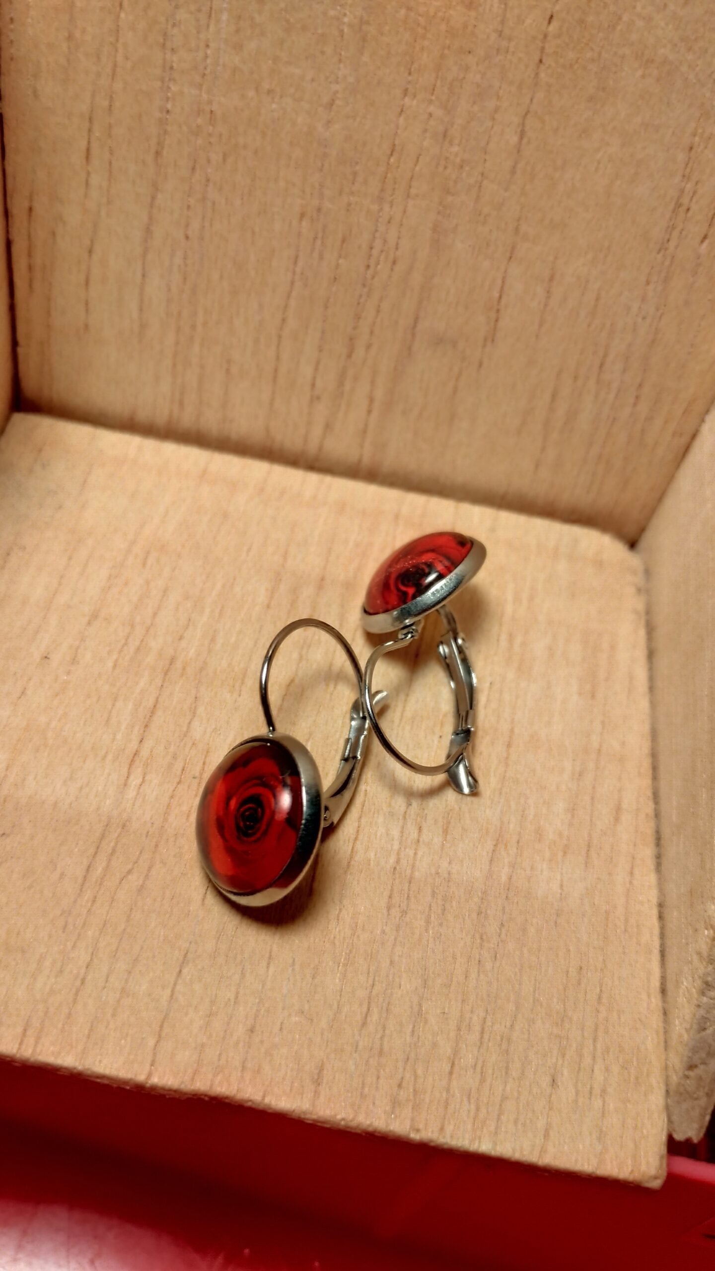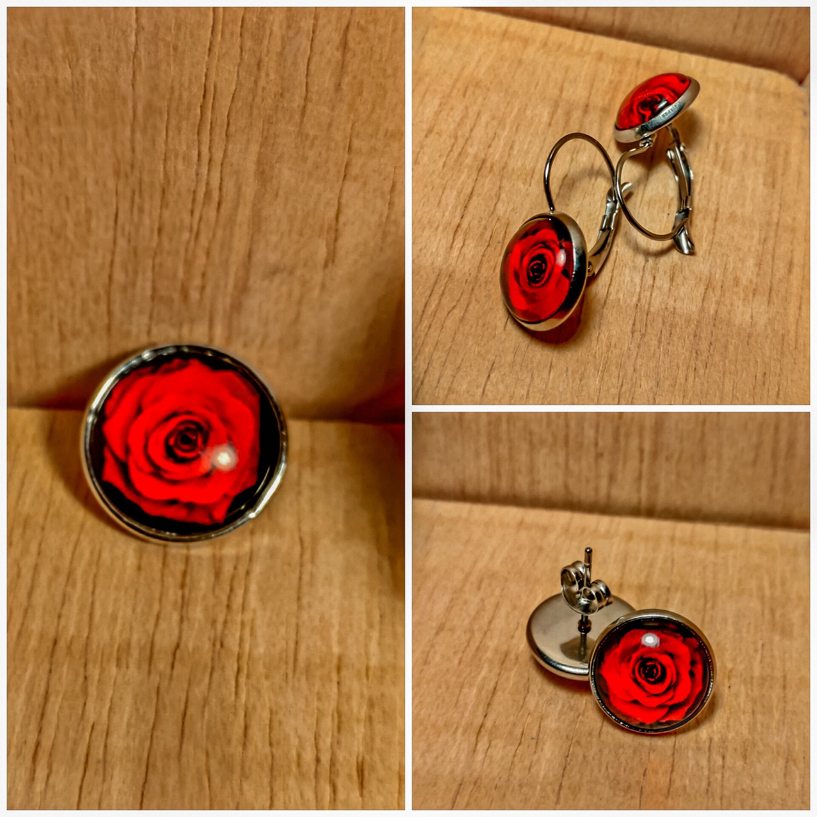 Dieses Set besteht aus einem Cabochon-Druckknopf und einem passenden Paar Hängeohrringen oder Ohrstecker.